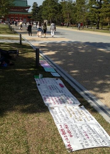 *****2つめ かんじ つかって ません***** みなさん、はんにちわ。 前回はまだまだ春とはいえない2月末にデモを行いましたね。 ちなみに4月や5月はこんな風に朝鮮制裁に反対する青空展示をしたりしてました。 (観光地、平安神宮前で朝鮮制裁の年表…